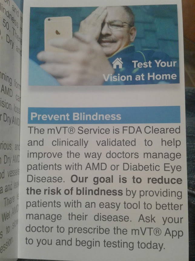 With a more detailed scan of the brochure cover, I learned that the mVT® App is cleared by the FDA to help detect deteriorating vision among people who are at risk of losing their eyesight.